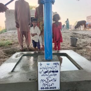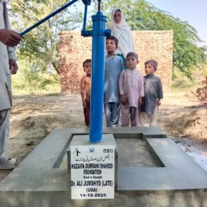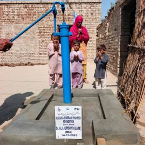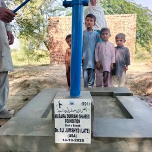 Huzaifa Durrani Shaheed Foundation (HDSF) has shown strong resolve to provide drinking water to poor and needy widows and disabled persons at their door step in Districts/Tehsils and Villages of Southern Punjab. In this connection HDSF spearheaded a campaign of establishing Hand Pumps enabling disabled and widows to get quick water without facing any problem. HDSF has so far provided 50 hand pumps and is scheduled to provide another 5000 hand pumps to disabled persons.